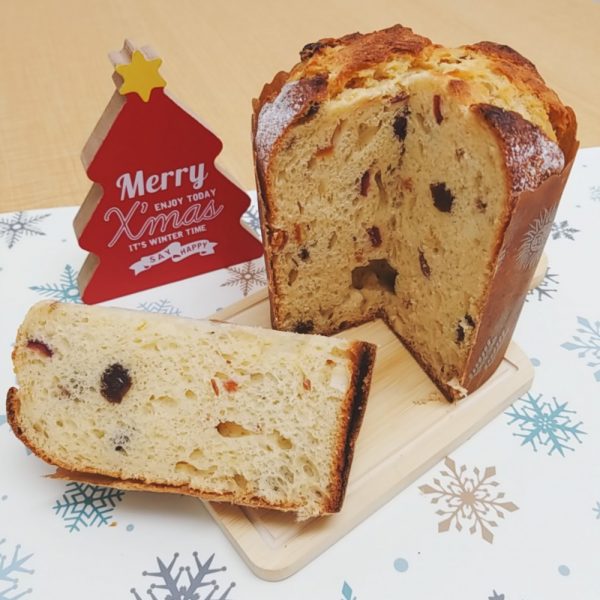 レーズン、オレンジピール、クランベリーをお酒に漬け込んで焼き上げました♪イタリア伝統の発酵菓子パンです。 今年から、食べきりサイズの1/4cutも登場♪