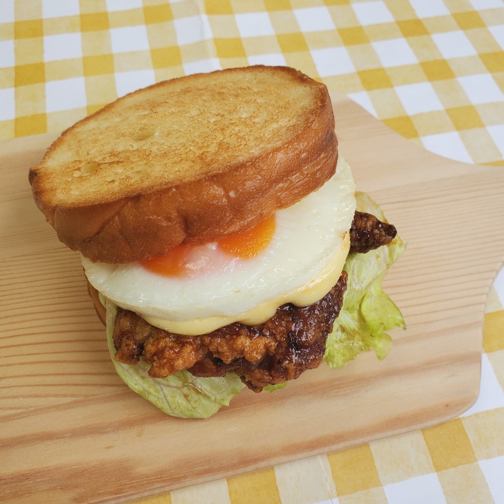 テリヤキソースをからめたジューシーなチキンにまろやかなたまごを合わせて春らしいバーガーに🌼